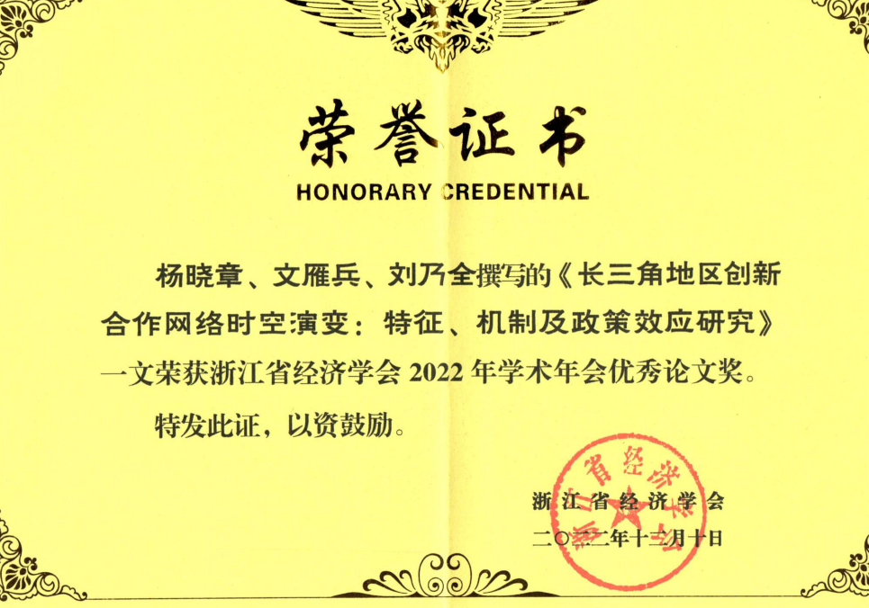 本次学术年会共征集近百篇高质量论文,其中48篇论文入选线上分论坛交流。经本届年会组委会专家严格评审,百家乐最稳打法 杨晓章博士递交的学术论文《长三角地区创新合作网络时空演变:特征、机制及政策效应研究》荣获浙江省经济学会2022年学术年会优秀论文奖。