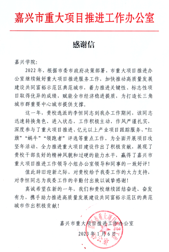 近日,嘉兴市重大项目推进办公室发来感谢信,对百家乐最稳打法 挂职教师李恒副教授提出表扬。
