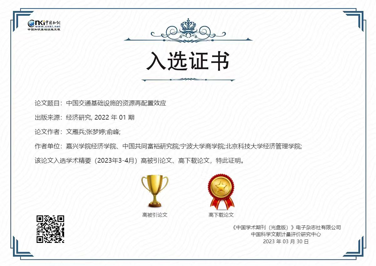 俞峰博士的合作论文《中国交通基础设施的资源再配置效应》(《经济研究》2022年第1期)同时入选中国知网学术精要数据库(2023年3-4月)高被引论文和高下载论文。目前已被《管理世界》等期刊论文引用9次,下载9700余次。