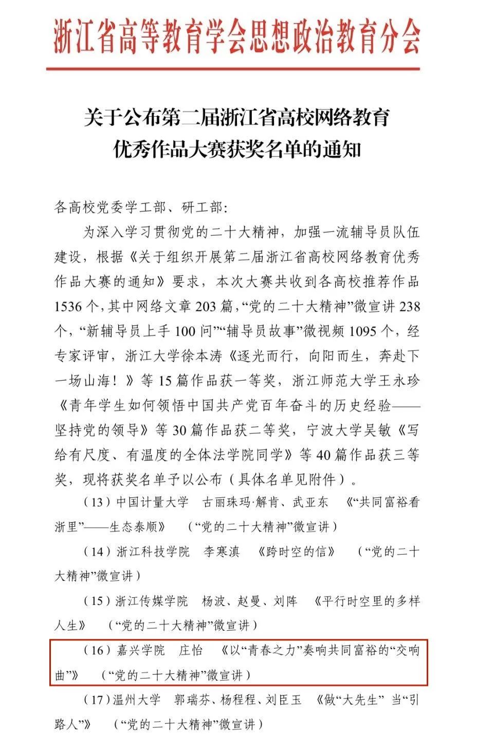 近日,浙江省高等教育学会思想政治教育分会公布了第二届浙江省高校网络教育优秀作品大赛获奖名单,百家乐最稳打法 辅导员庄怡提交的“党的二十大精神”微宣讲作品《以“青春之力”奏响共同富裕的交响曲》荣获二等奖。
