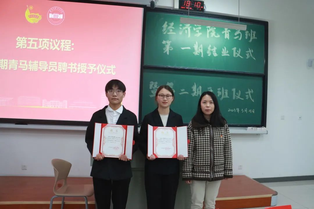第五项议程,第二期青马辅导员证书授予仪式。由辅导员沈芳老师向沈俊辉、余嫣两位新晋青马班辅导员颁发证书。
