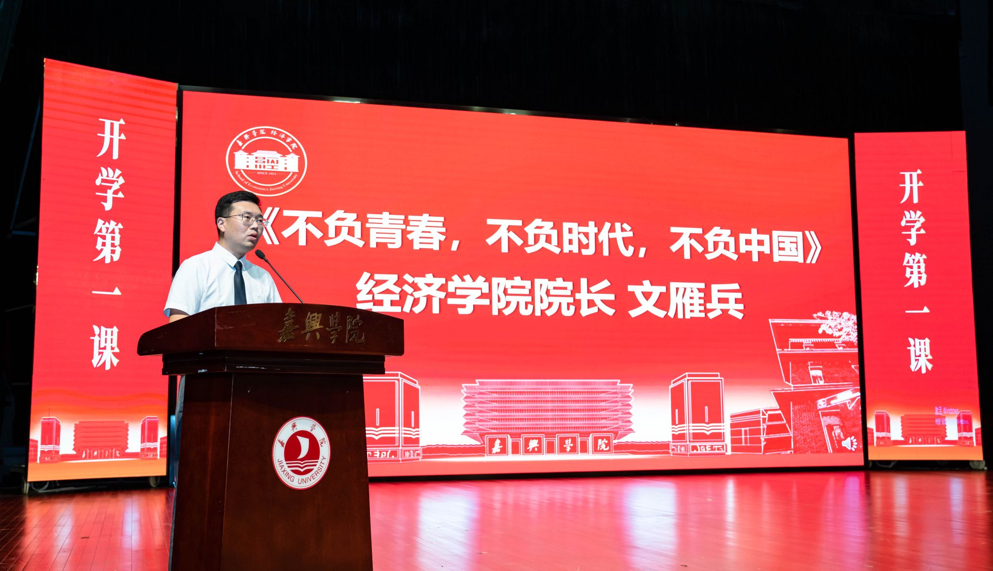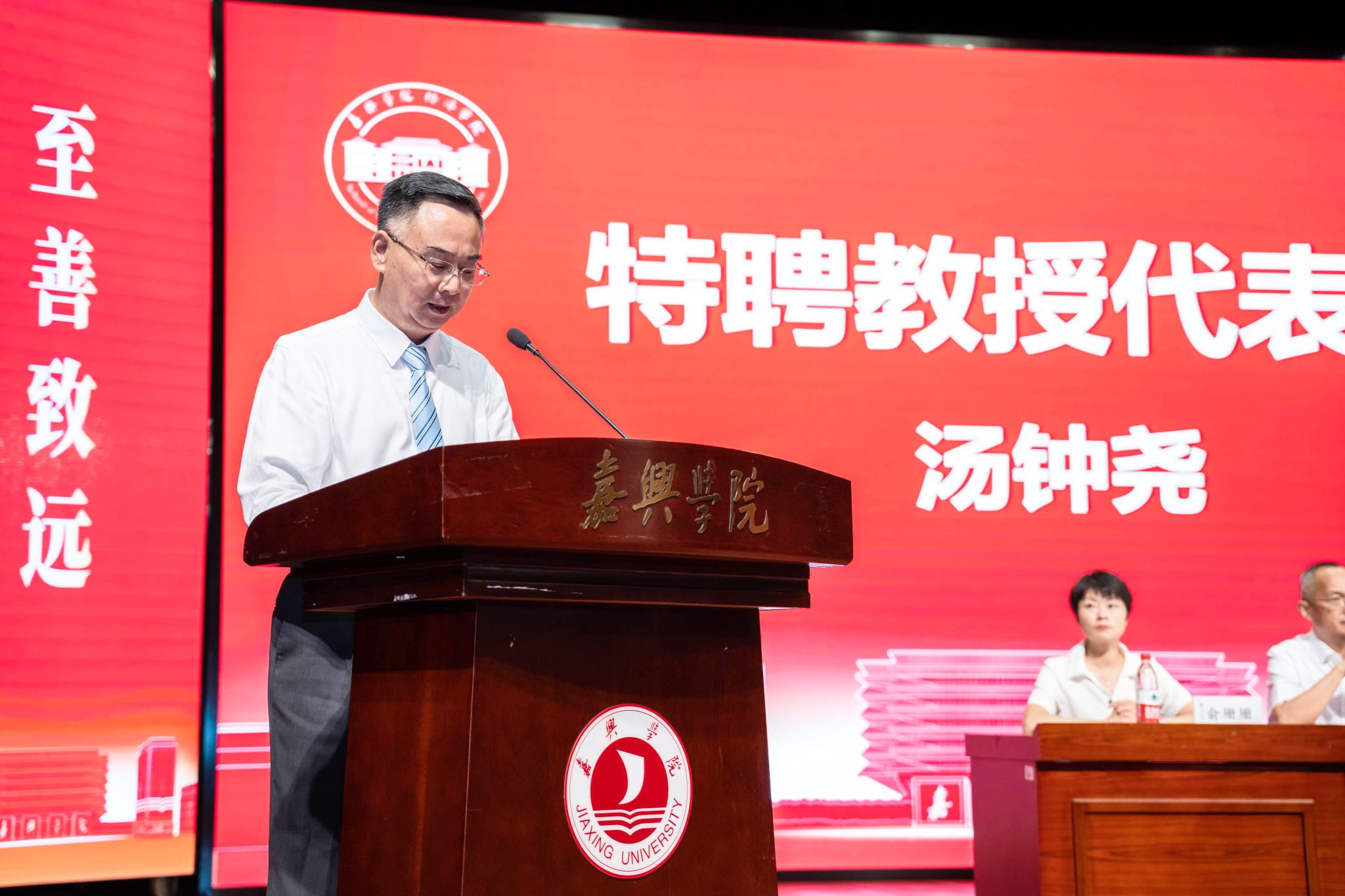 原中国人民银行嘉兴市中心支行党委委员、副行长汤钟尧作为特聘教授代表发言,他结合自身丰富的从业经验和人生阅历,分享了他对青春、对大学、对成长、对责任与使命的理解。