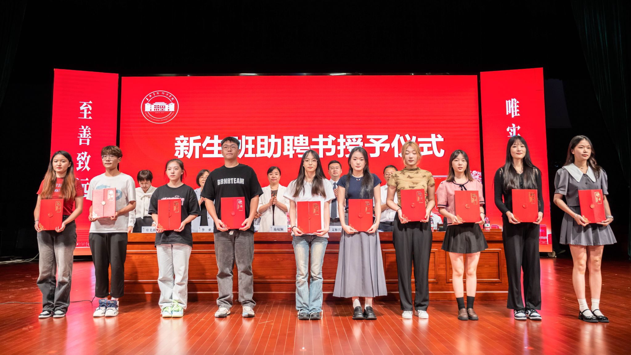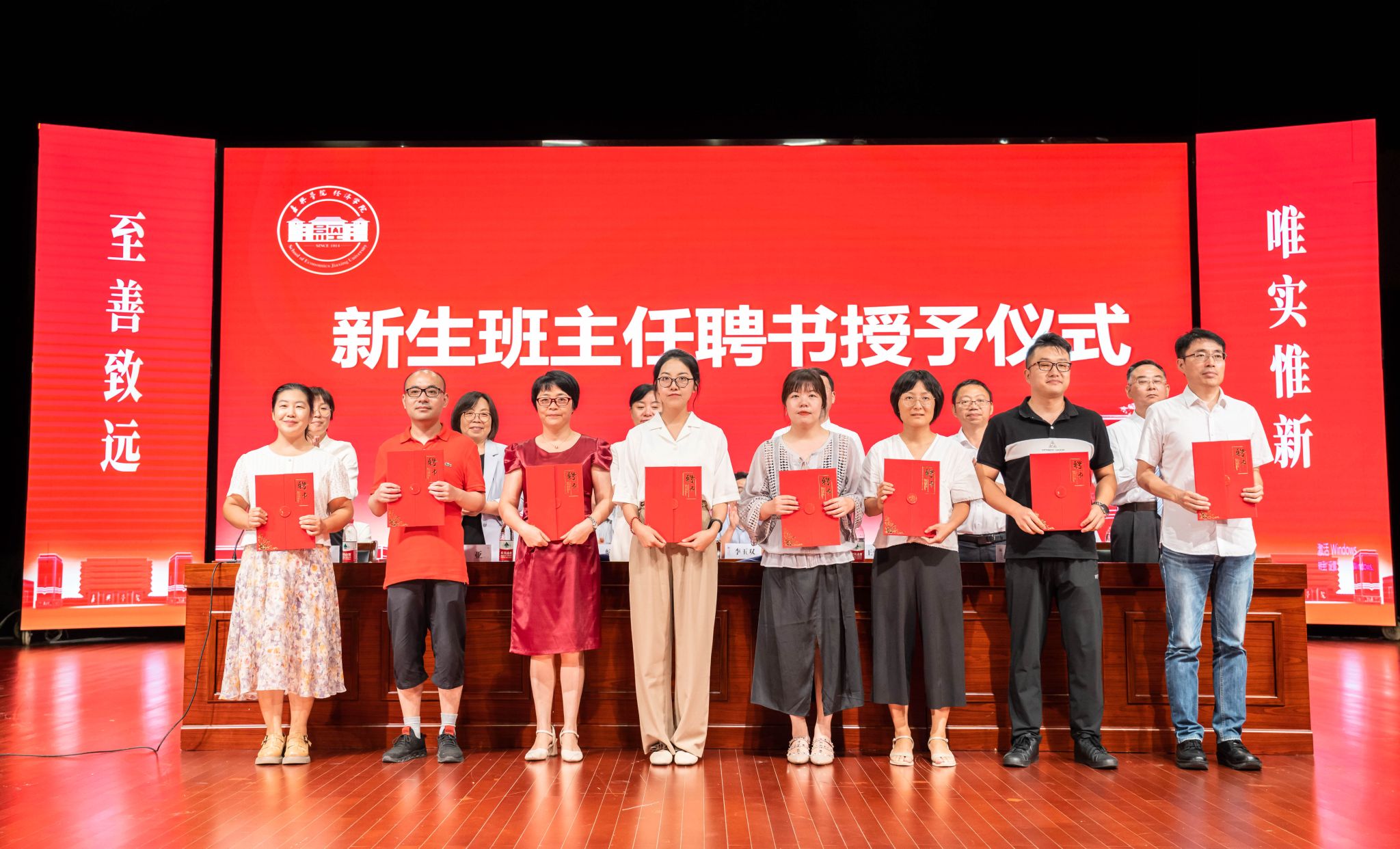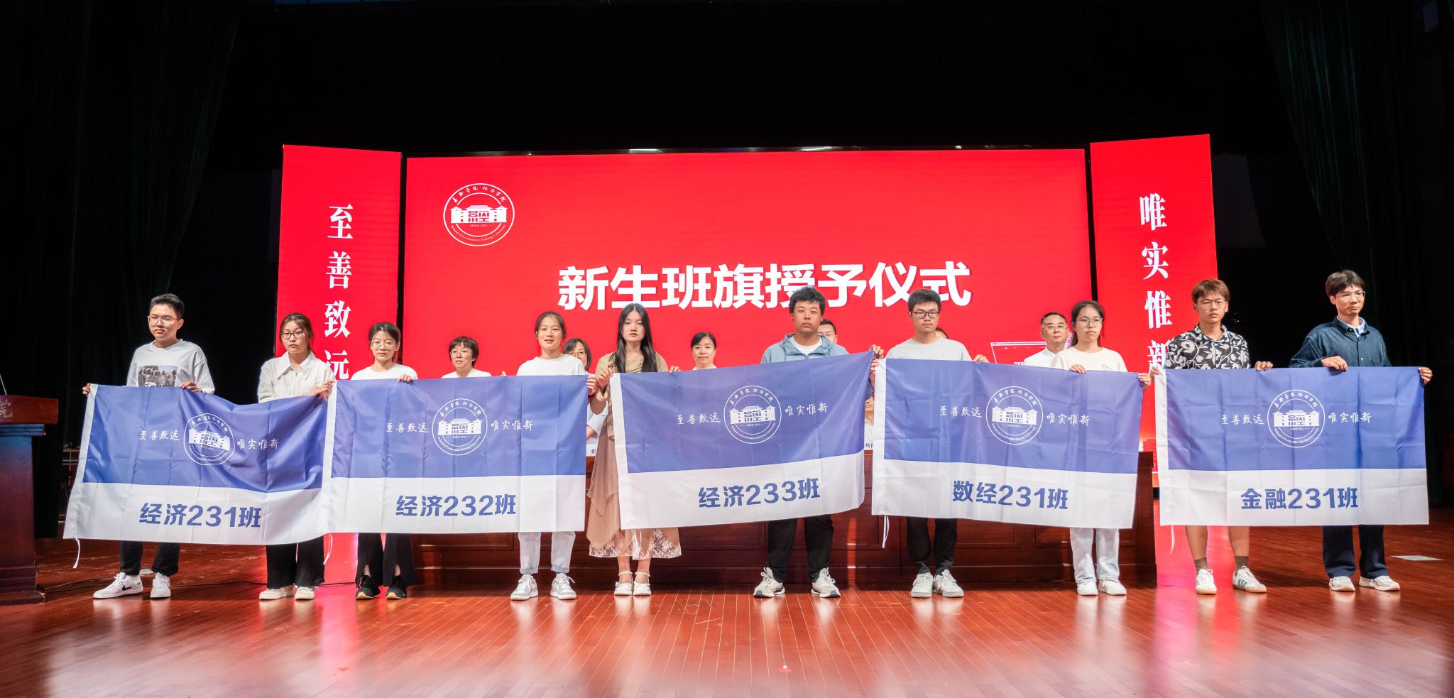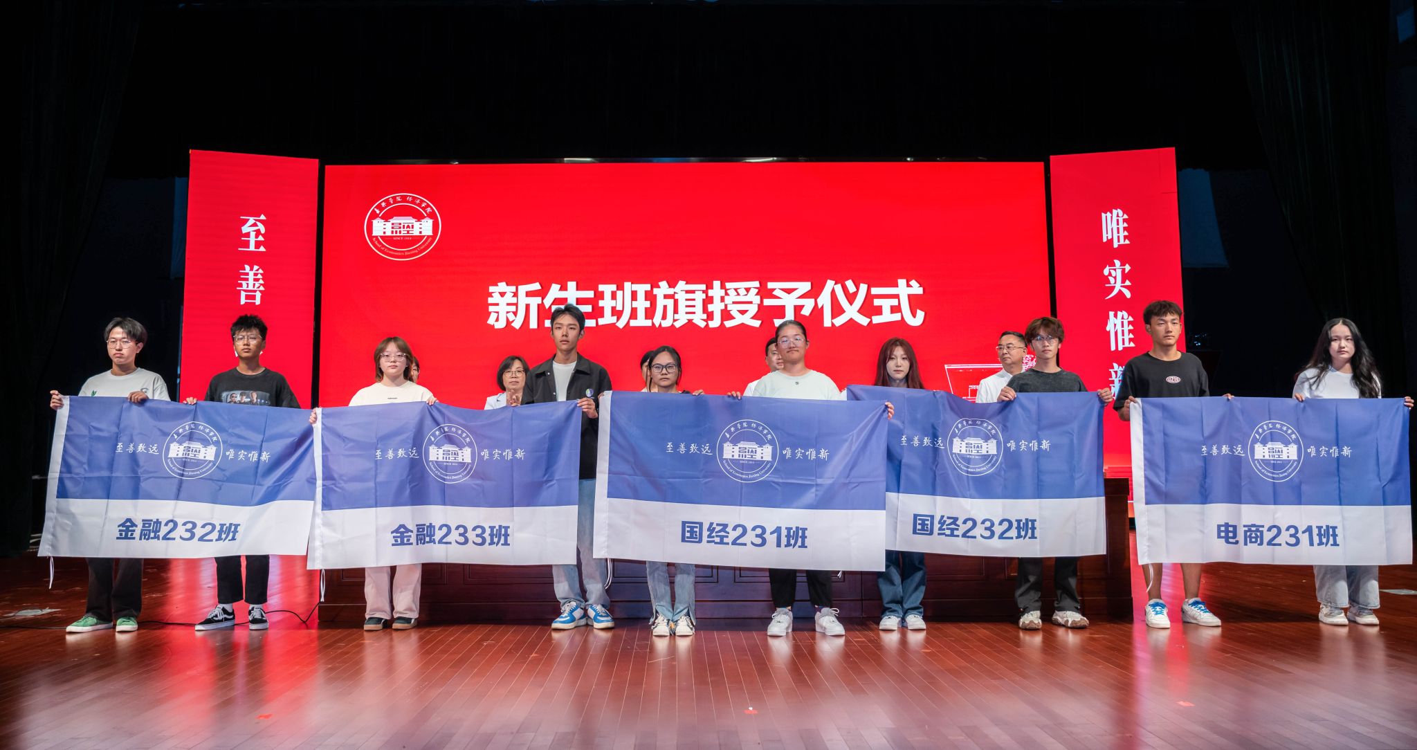 为新生班主任及班主任助理发放了聘书,新生各班代表也展示了班级的班旗,表达了他们对大学未来四年的憧憬和期许。