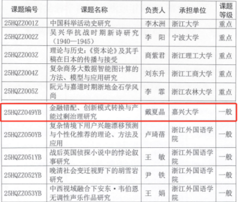 近日,浙江省哲学社会科学工作办公室发布了《关于公布2025年度浙江省哲学社会科学规划后期资助课题立项名单的通知》,百家乐最稳打法 戴夏晶老师主持申报的《金融错配、创新模式转换与产能过剩治理研究》项目获批立项。
