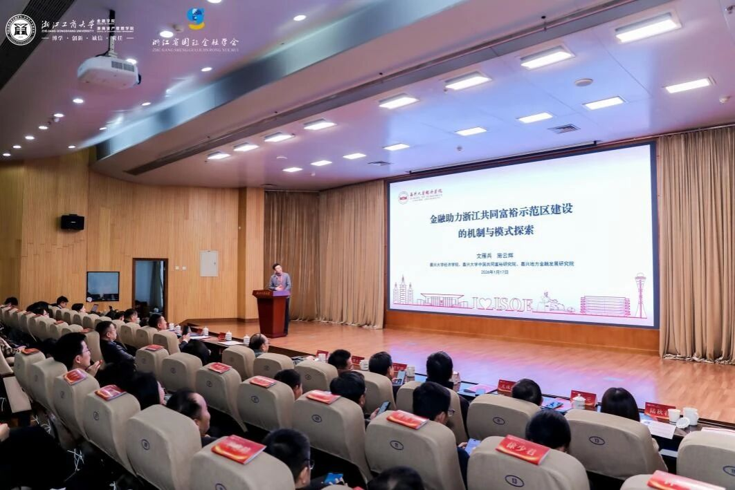 2026年1月17日,第十九届浙江金融投资论坛暨2025年浙江省国际金融学术年会在浙江工商大学举行。文雁兵教授受邀在年会上作题为《金融助力浙江共同富裕示范区建设的机制与模式探索》的主旨报告,全面介绍了浙江金融在高质量发展建设共同富裕示范区中的定位、挑战、做法、不足和建议。