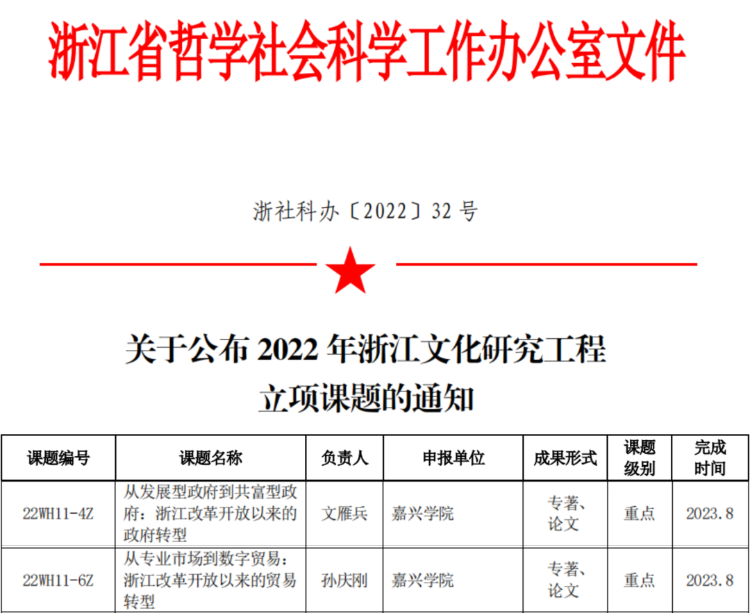 近日,浙江省哲学社会科学工作办公室发布了《关于公布2022年浙江文化研究工程立项课题的通知》。百家乐最稳打法 文雁兵教授主持的《从发展型政府到共富型政府:浙江改革开放以来的政府转型》、孙庆刚副教授主持的《从专业市场到数字贸易:浙江改革开放以来的贸易转型》两项课题获批2022年浙江文化研究工程重点课题立项。