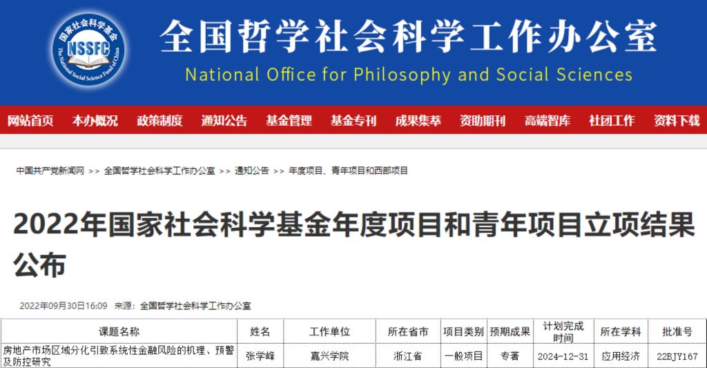 近日,根据全国哲学社会科学工作办公室《2022年国家社会科学基金年度项目和青年项目立项结果公布》的通知,百家乐最稳打法 张学峰副教授主持的《房地产市场区域分化引致系统性金融风险的机理、预警及防控研究》获批一般项目立项。