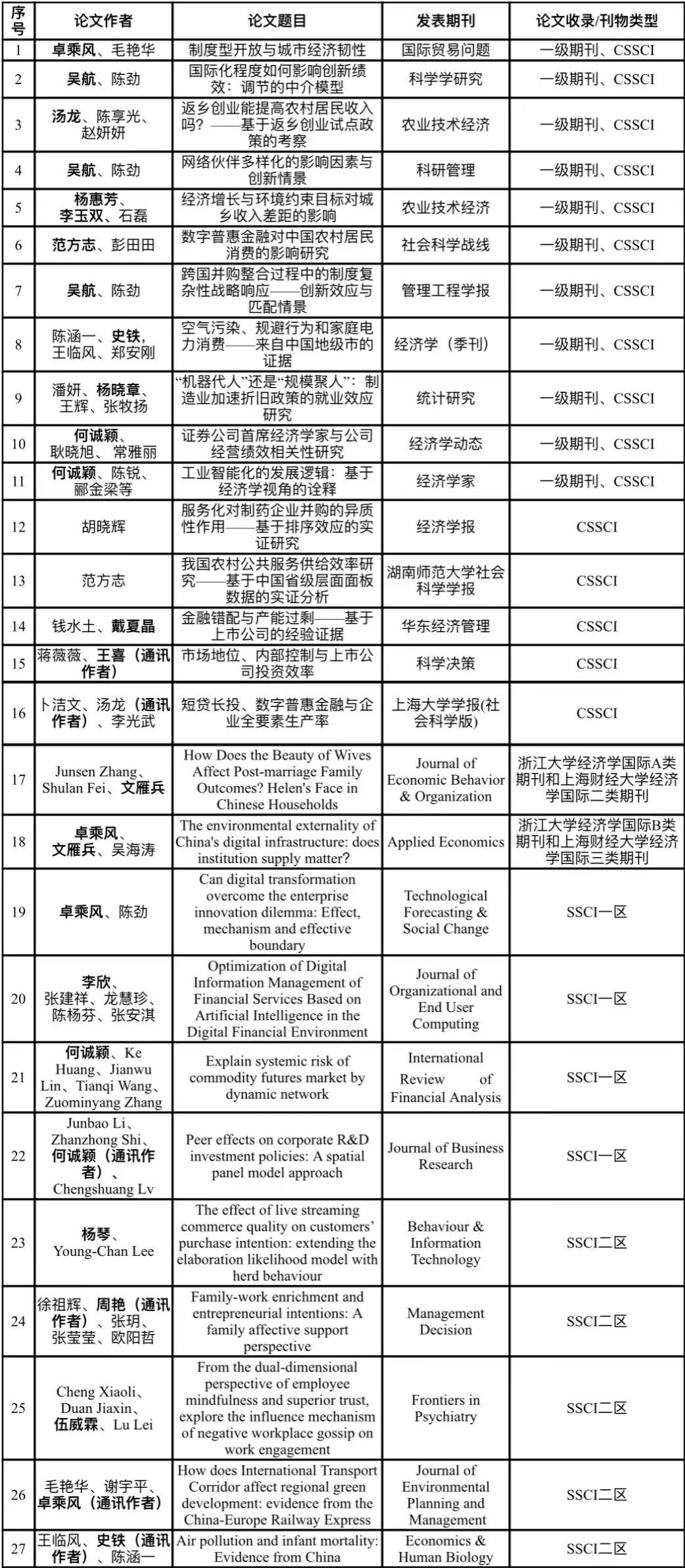 教师独立或合作在《经济学(季刊)》《统计研究》《国际贸易问题》《农业技术经济》《科研管理》,以及Journal of Economic Behavior & Organization、Applied Economics、Management Decision等国内外知名期刊上发表高水平学术论文32篇,其中,中文社会科学引文索引(CSSCI)期刊论文16篇(含中文一级期刊论文11篇)、SSCI/SCI收录论文16篇。
