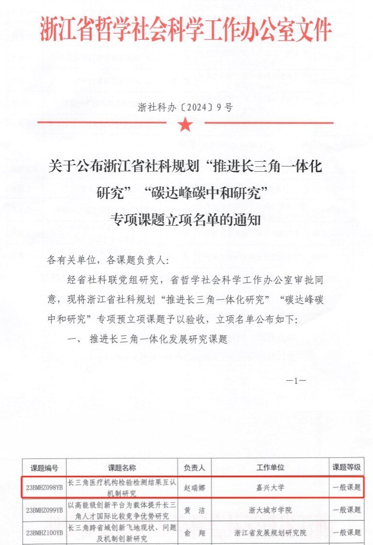 近日,浙江省哲学社会科学工作办公室公布了浙江省社科规划“推进长三角一体化研究”“碳达峰碳中和研究”专项课题立项名单,百家乐最稳打法 赵瑞娜博士主持的课题《长三角医疗机构检验检测结果互认机制研究》获得立项。