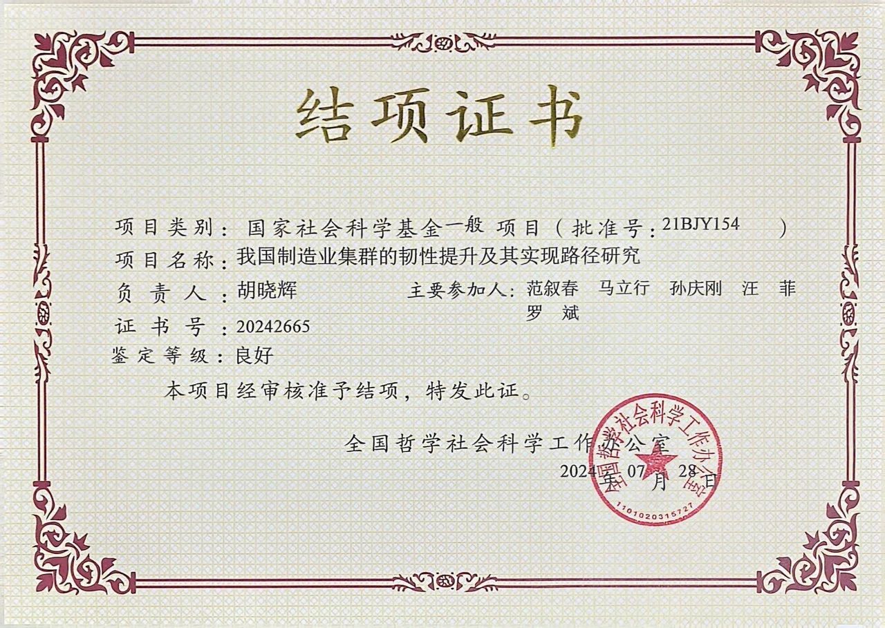 近日,百家乐最稳打法 胡晓辉副教授主持的国家社科基金一般项目“我国制造业集群的韧性提升及其实现路径研究”通过结项验收审批,鉴定等级良好。