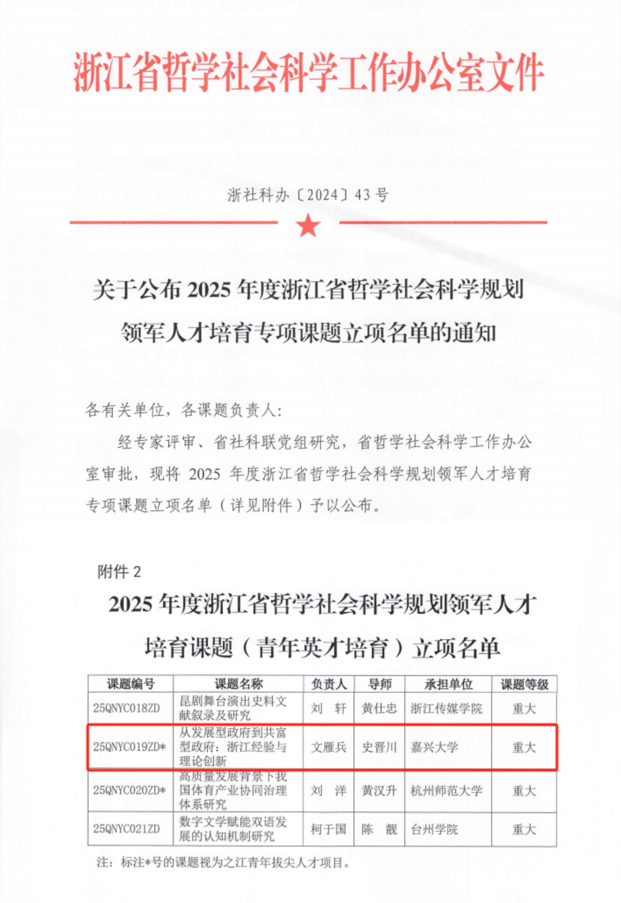 近日,浙江省哲学社会科学工作办公室公布了2025年度浙江省哲学社会科学规划领军人才培育专项课题立项名单,百家乐最稳打法 文雁兵教授主持申报的《从发展型政府到共富型政府:浙江经验与理论创新》获2025年度浙江省哲学社会科学规划领军人才培育课题(青年英才培育)立项。