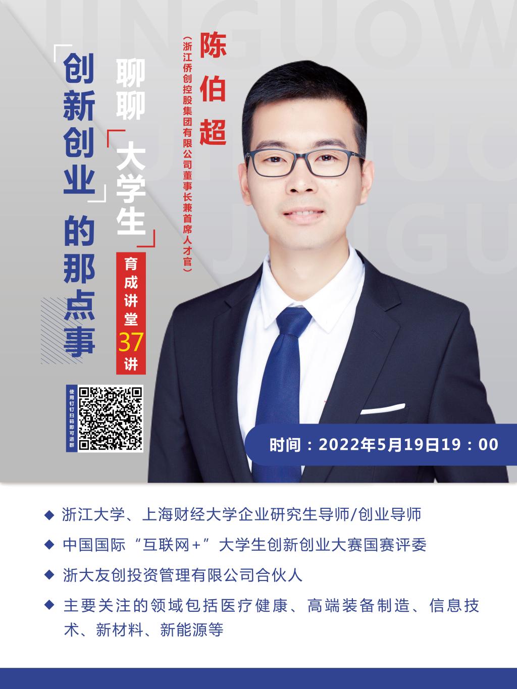519日晚,浙江侨创控股集团有限公司董事长兼首席人才官、中国国际“互联网+”大学生创新创业大赛国赛评委陈伯超应邀作客育成讲堂第37讲,为近500名师生作题为“聊聊大学生创新创业的那点事”的云讲座。此次云讲座由创业百家乐最稳打法 主办、百家乐最稳打法 承办。