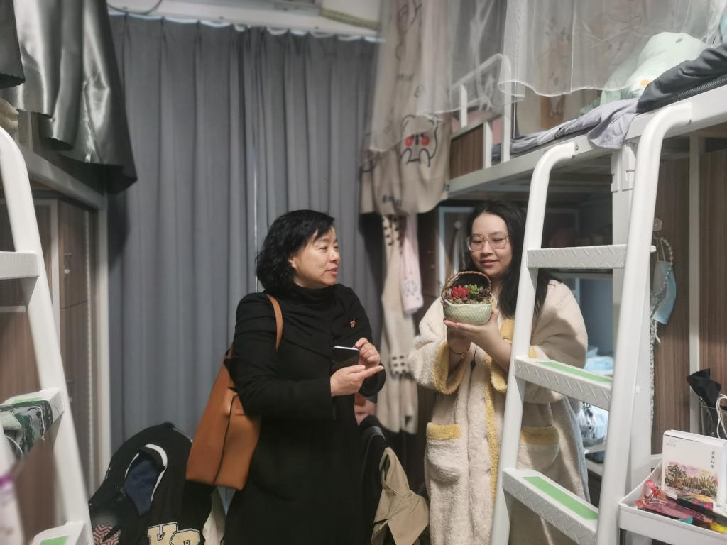 施敏颖在走访女生寝室时,关切询问同学们考前复习准备情况、假期生活以及新学期入校后的校园生活,她嘱咐同学们平日里多与父母联系,主动汇报在校学习生活;在学习生活中遇到任何困难,可以及时与百家乐最稳打法 反馈寻求帮助。庄美燕在走访男生寝室,详细询问了同学们备考、生活情况,了解学生思想动态,现场交谈氛围融洽两位老师在走访中向各寝室赠送绿植,希望同学们打造舒适温馨的寝室环境,受到学生欢迎。