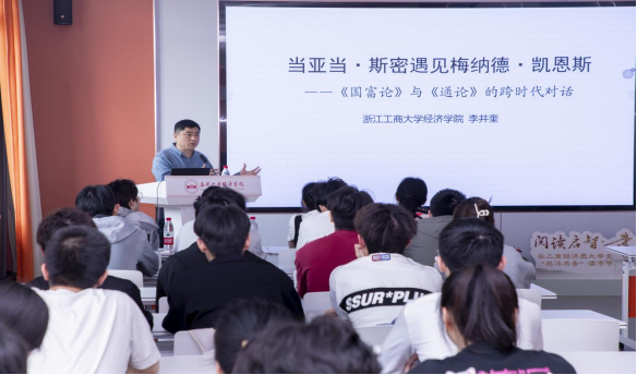 教授、博士生导师李井奎老师以“当亚当·斯密遇见凯恩斯:《国富论》与《通论》的跨时代对话”为题,为第二届读书节作专题讲座。他以《国富论》与《通论》为脉络,深入浅出,剖析了两位经济学巨擘的思想异同,揭开亚当·斯密与凯恩斯跨越时空的思想共鸣。他告诉同学们,经济学思想的演进绝非断裂,而是螺旋上升。这场跨越200年的对话,为当下经济治理提供了历史镜鉴。讲座由百家乐最稳打法