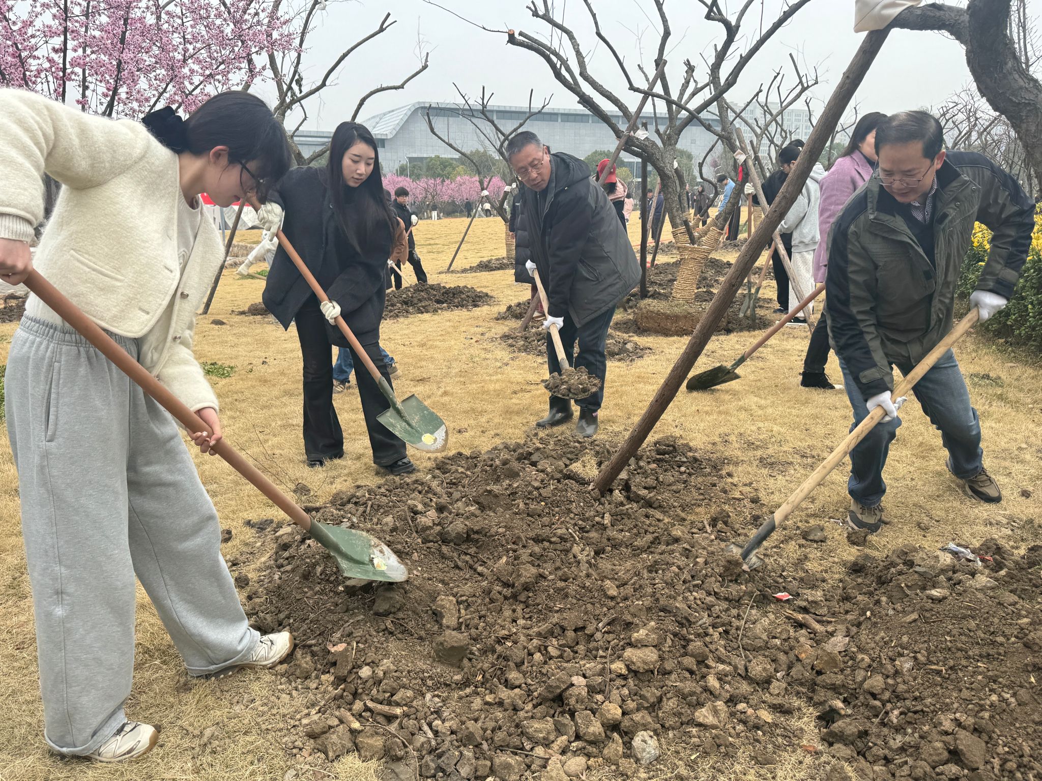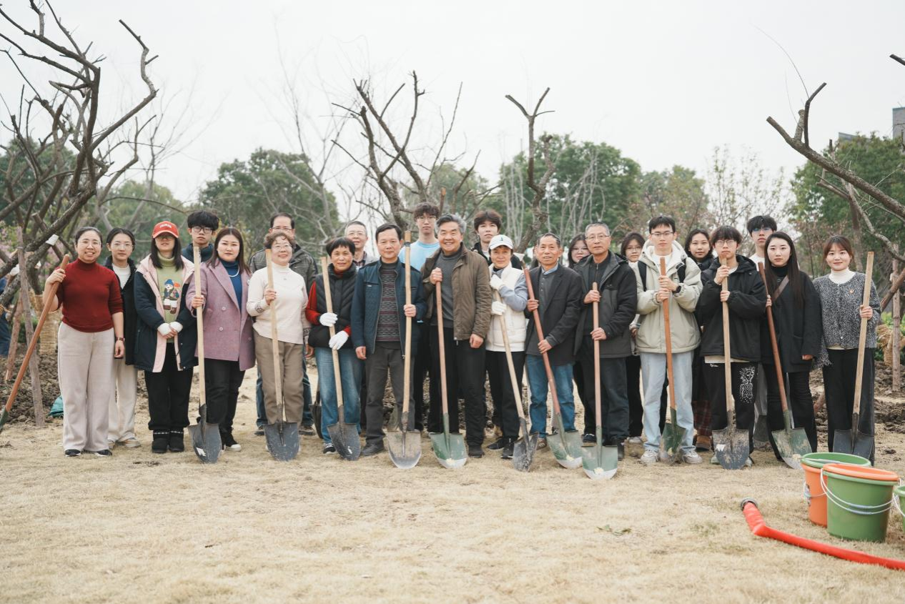在绿化养护人员的专业指导下,参与植树的师生分工协作,现场一派热火朝天的劳动景象。大家手握铁锹,分工协作,铲土挖坑,扶苗摆正,浇水润苗,亲手种下对嘉大的美好祝福和对未来的美好憧憬,共同助力绿色低碳校园建设。经过辛勤劳动,新种下的树苗迎风挺立,展现出勃勃生机,为明媚的三月增添了绿意。