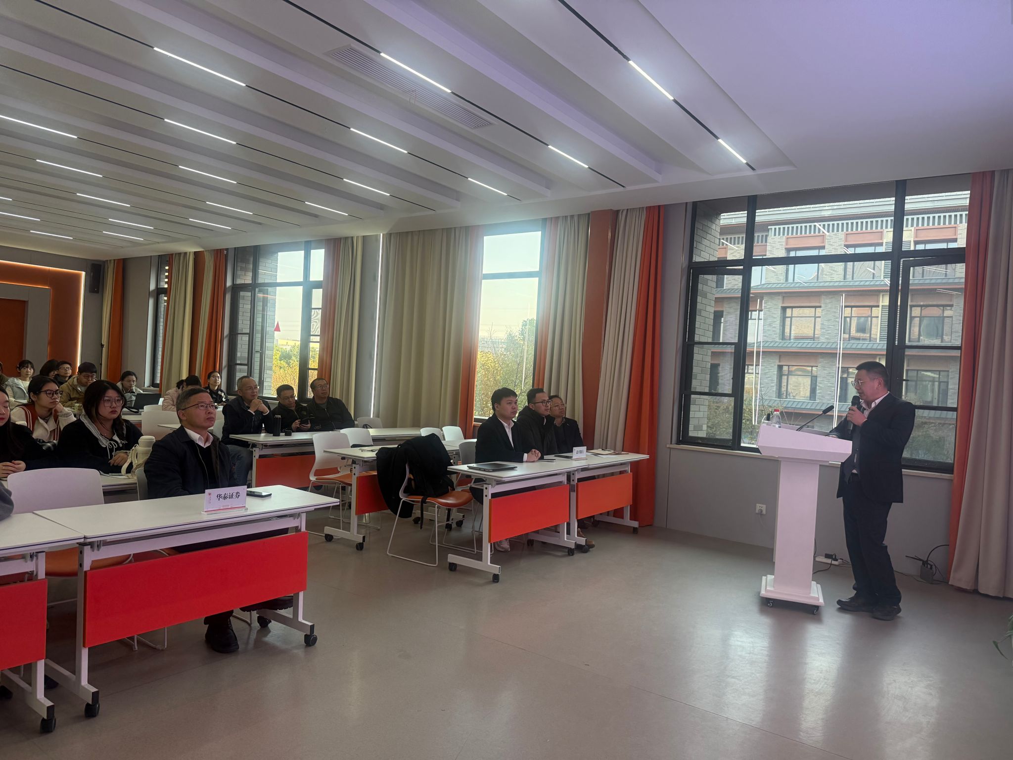 副院长兼金融教师党支部书记孙庆刚教授主持报告会,联建支部嘉兴银行总行直属第六党支部和财通证券嘉兴分公司党支部党员代表、华泰证券嘉兴纺工路营业部总经理王贯杰等地方金融机构代表、金融教师党支部党员、金融硕士导师、金融硕士研究生和部分相关学科本科生参加。