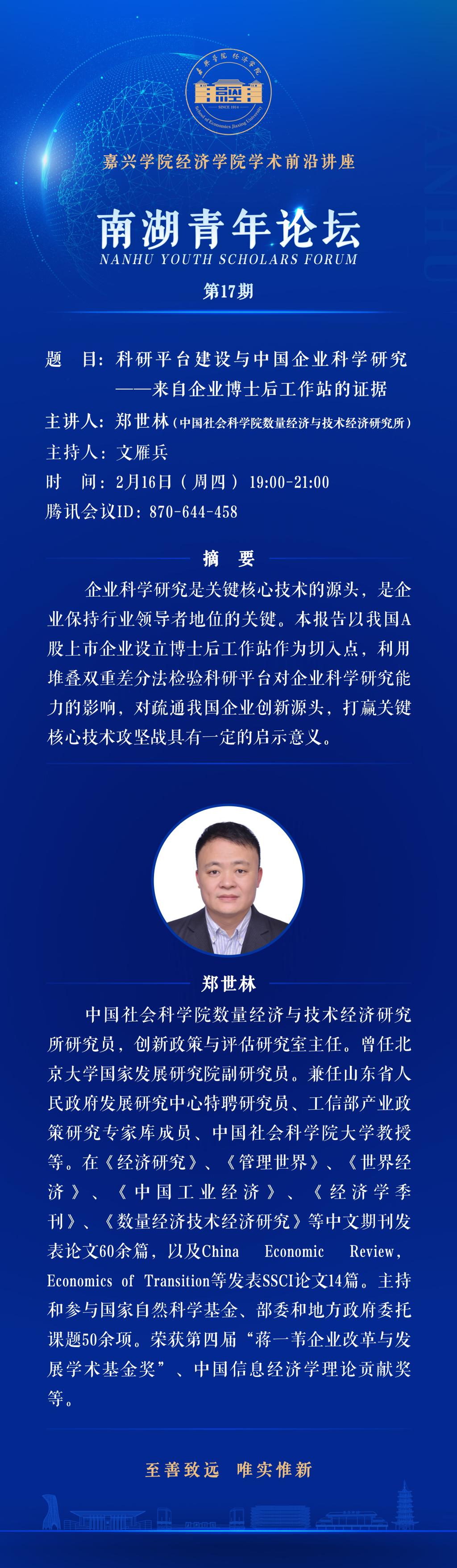 南湖青年论坛NO.17:科研平台建设与中国企业科学研究——来自企业博士后工作站的证据