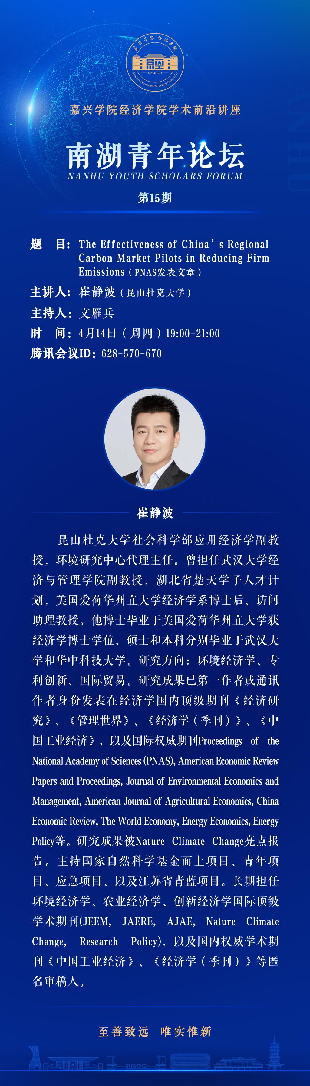 南湖青年论坛NO.15:The Effectiveness of China's Regional Carbon Market Pilots in Reducing Firm Emissions ( PNAS发表文章)